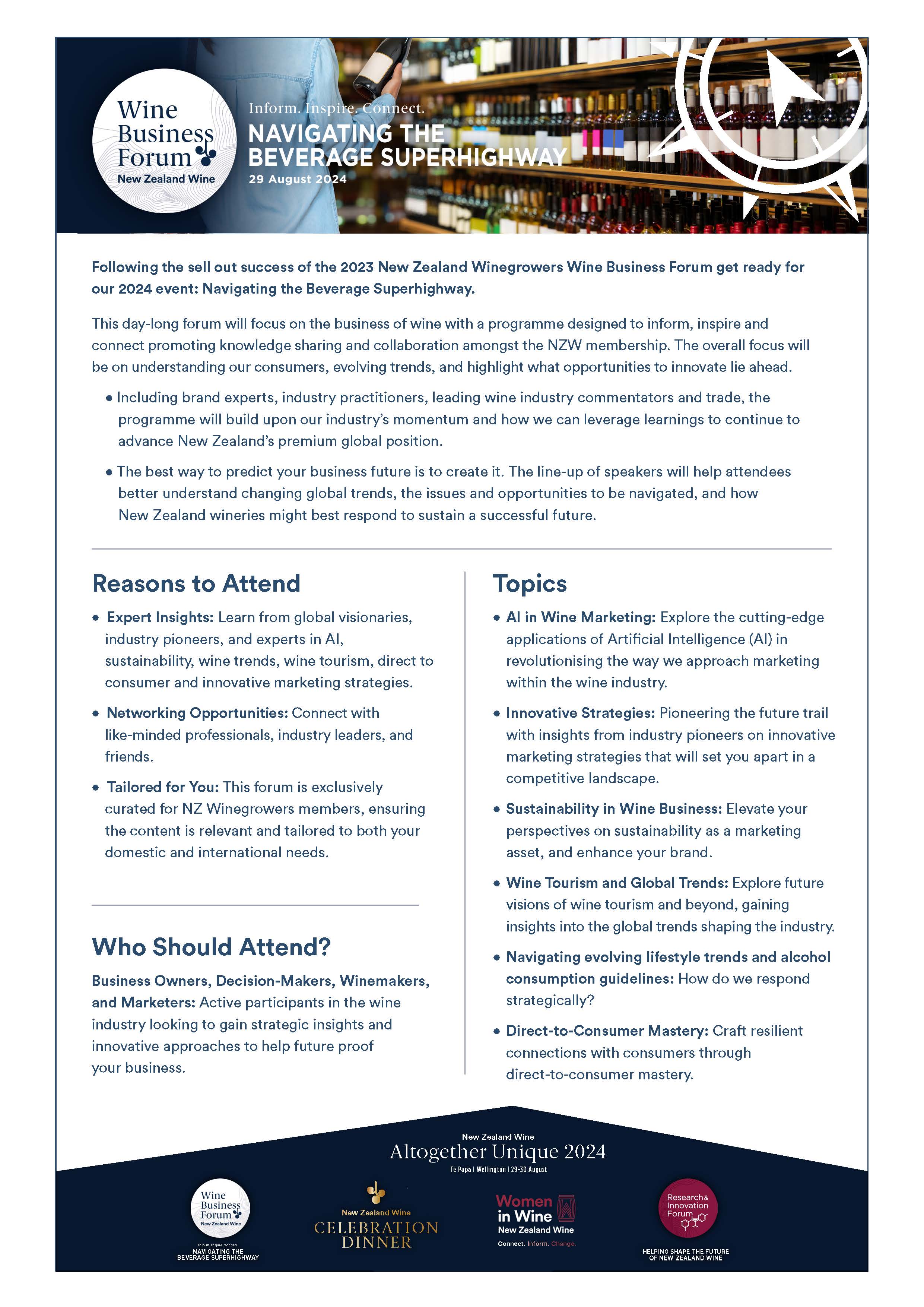 The Wine Business Forum covered: AI in wine marketing; innovative marketing strategies; sustainability in wine business; the future of wine tourism and global trends; navigating evolving lifestyle trends and alcohol consumption guidelines; direct-to-consumer mastery.